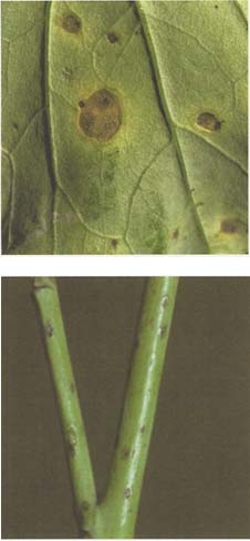 - Leaf; light green and circular to irregular in shape. Spots become paper-thin and buff-colored with age and contain numerous pycnidia.